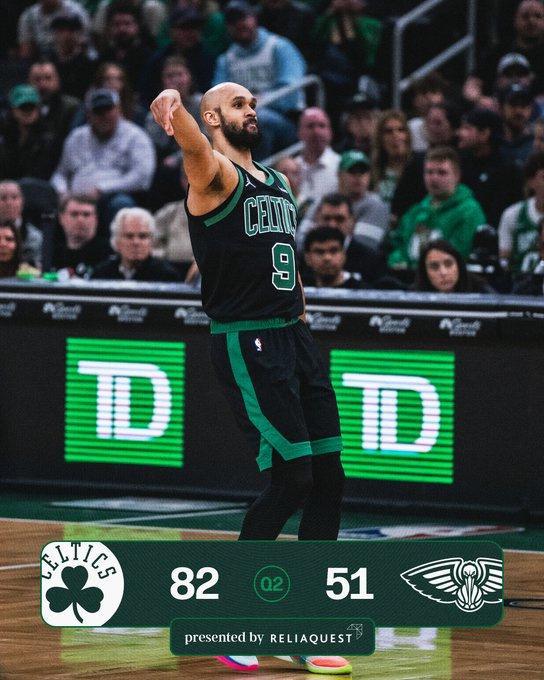 次节比赛,凯尔特人连续两节单节得分35+,且限制鹈鹕连续两节单节不足30分。凯尔特人继续攻防压制逐步扩大30+领先优势,前两节比赛,凯尔特人三分30中17,追平队史半场三分命中数纪录,布朗10中7得到20分、普里查德3记三分15分5助攻与武切维奇4中4得到11分。鹈鹕三分20中5,费尔斯15分与奎因10+6。凯尔特人单节38-26再赢12分,上半场结束凯尔特人已经扩大82-51领先鹈鹕31分巨大优势。